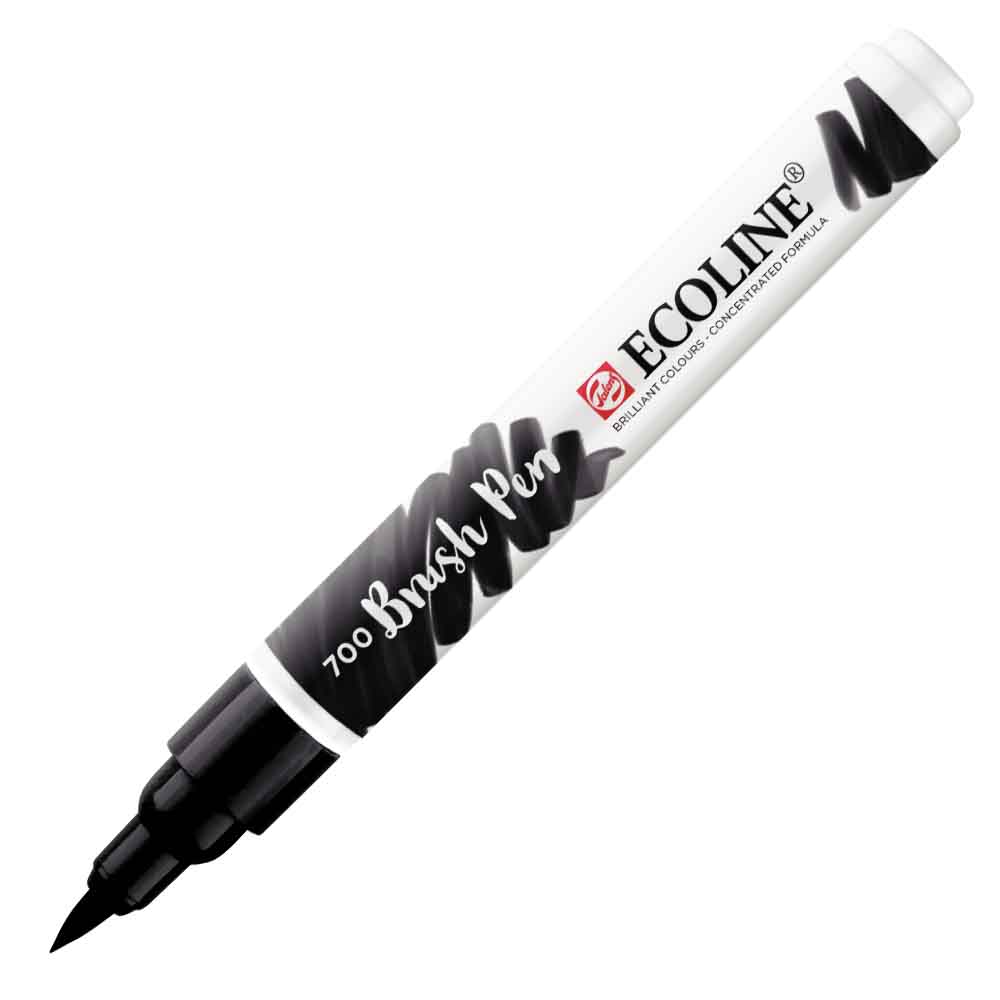 Caneta Ecoline Brush Pen Preto cores brilhantes concentrada, cria efeitos aquarelados, faz degradês e é recarregável. Caso esqueça de tampar e a ponta secar, umideça com água e a recupere rapidamente. Brush pen Ecoline faz linhas finas e precisas, traços enérgicos, colorir grandes áreas e finalização de trabalhos. Indicado para técnicas de Hand Lettering, Caligrafia e Desenho.