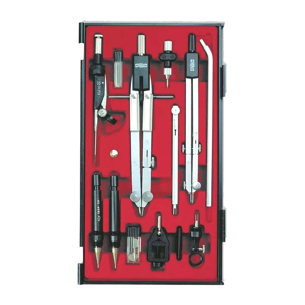 Compasso profissional para técnicos e escritórios de engenharia. Kit compasso para desenho técnico composto por bússolas de ajuste rápido, bússolas telescópicas, bússola de arco para canetas-tinteiro, bússolas de extensão, barras de extensão e corrediça, adaptador de bússola e adaptador universal, chave de fenda com suporte, parte central, lapiseira, tubo de grafite e um estojo com peças de reposição. Todos os acessórios possuem diâmetro de fixação de 4mm. Desenha círculos com diâmetro de 1 mm a 600 mm, para dimensões maiores será utilizada barra extensora ou bússola, O adaptador e a extensão permitirão o uso de diferentes canetas técnicas, lápis e outras ferramentas de desenho de até 12 mm de diâmetro. O uso de uma peça é indicado nas instruções incluídas. A parte central evitará danos ao papel de desenho ao desenhar vários círculos a partir de um único ponto.